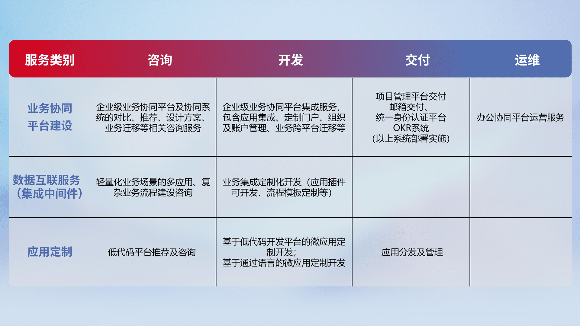 针对钉钉、、企微、、IDaas等平台级产品提供产品的规划、、、、方案、、、交付、、、定制化开发等服务,,,,实现如统一协同办公、、智能客户服务、、、、混合会议管理、、、、智能数据查询、、、等业务场景,,,,实现数字化转型。。。。