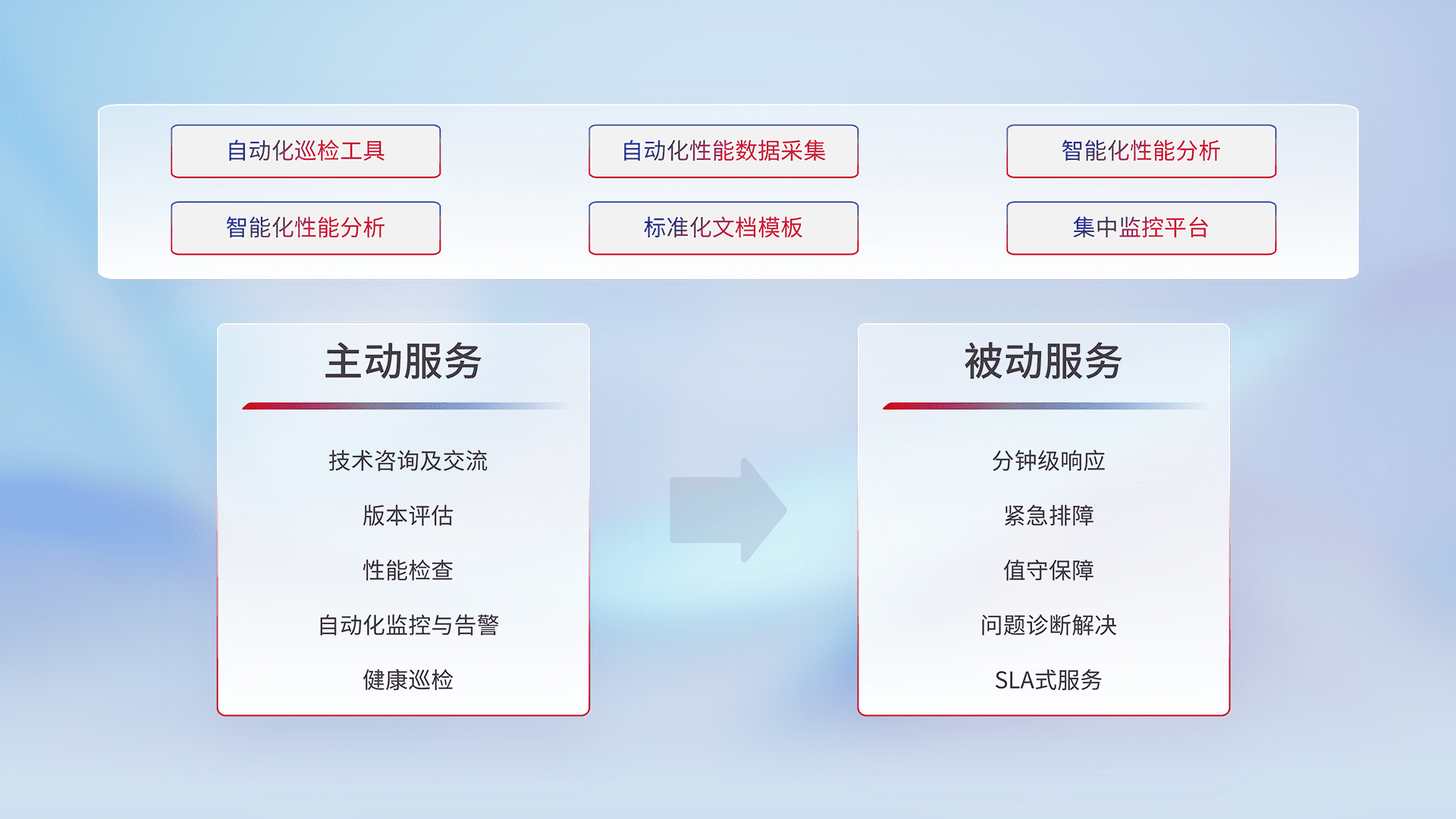 智能化工具和标准化文档,,,保障服务质量,,,,提供主动服务(包含技术咨询、、版本评估、、、性能检查、、、自动化监控与告警、、、、健康巡检)和被动服务包含(分钟级响应、、、紧急排障、、、值守保障、、、问题诊断解决、、、、SLA服务)。。。。